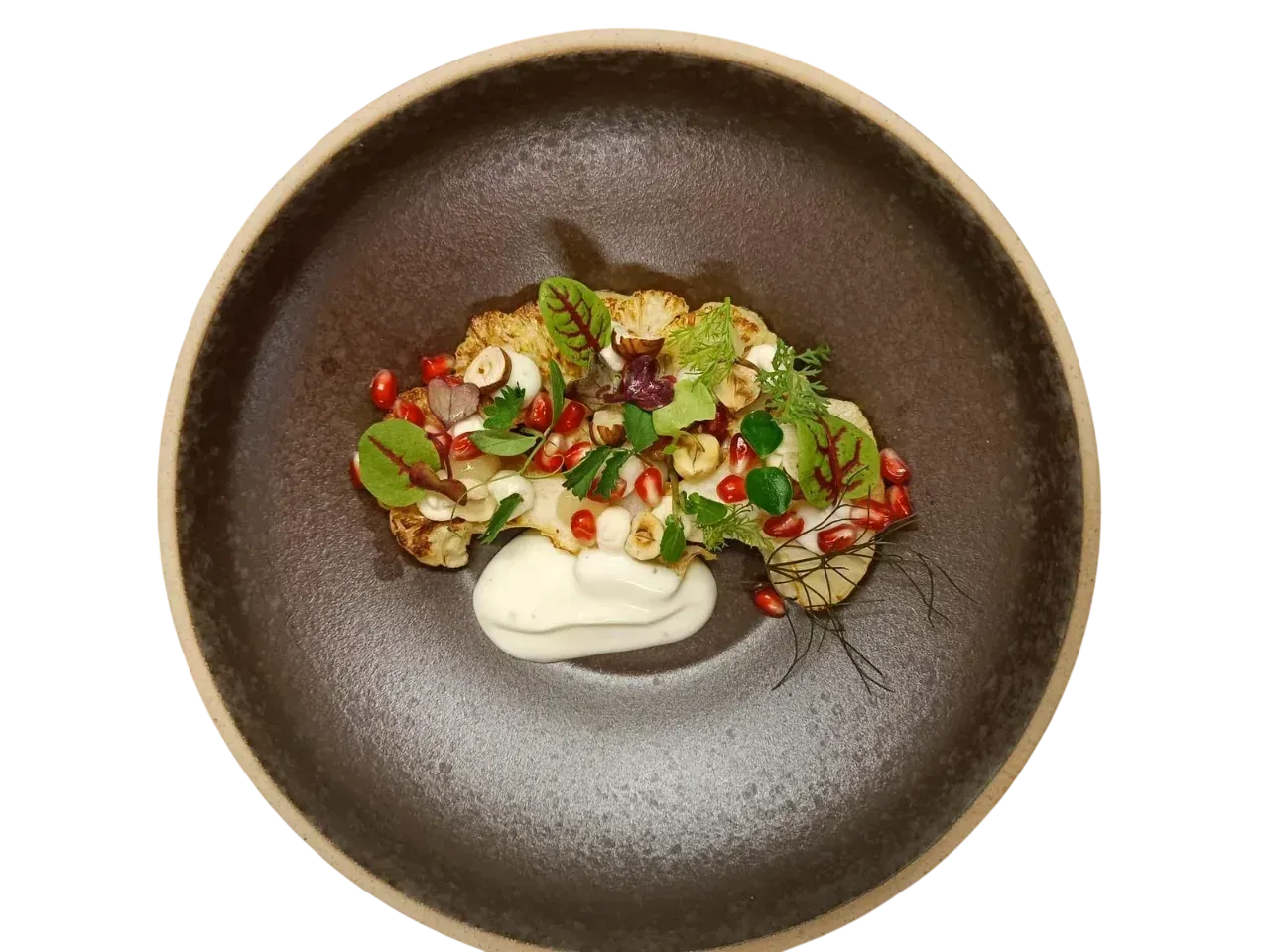- “Bacalao” de coliflor con tomate dulce, versión vegetal del clásico Valle Secreto